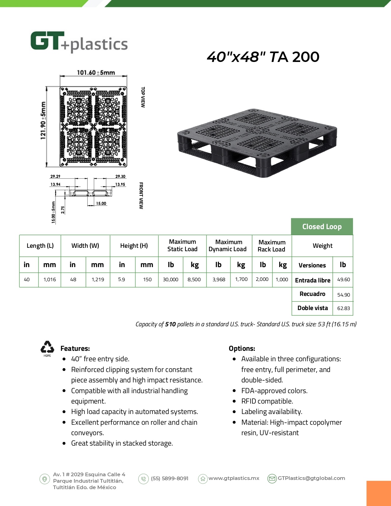 Capacity of 500 pallets in a standard U.S. truck (53 ft.)